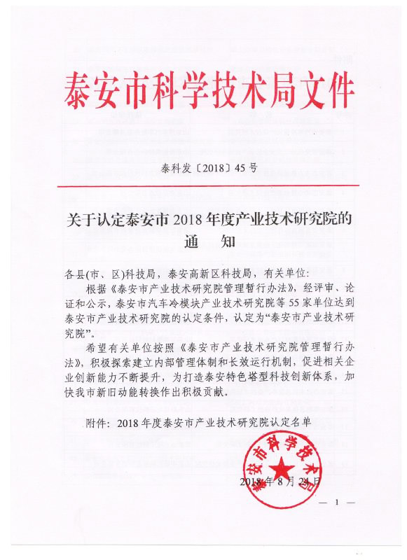 近日,根據(jù)《泰安市產(chǎn)業(yè)技術(shù)研究院管理暫行辦法》,經(jīng)評審,論證和公示,山東天路重工科技有限公司達(dá)到泰安市產(chǎn)業(yè)技術(shù)研究院的認(rèn)定條件,認(rèn)定為“泰安市產(chǎn)業(yè)技術(shù)研究院”。